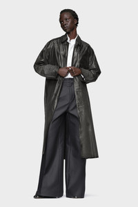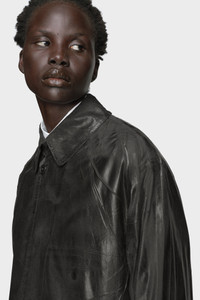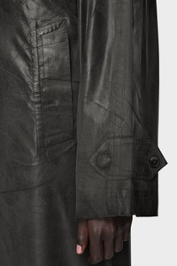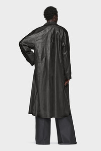Maison Margiela reimagines the trench coat through a distinctive foil-printed surface. Created using a layered process of airbrushed pigment and applied foil, then pressed to intensify contrast, each coat is uniquely finished by hand. The result is a glossy, broken texture that shifts with movement. At the back, the Maison’s signature four stitches appear; the opposite of a label. Product Details Item ID S29AH0173M35137900 Primary Fabric: 87% Polyester, 13% Polyamide-Nylon Lining: 100% Cotton Sleeve Lining: 100% Viscose-Rayon Long trench coat in foil-printed fabric Pointed collar Concealed front button fastening Back vent Made in Italy