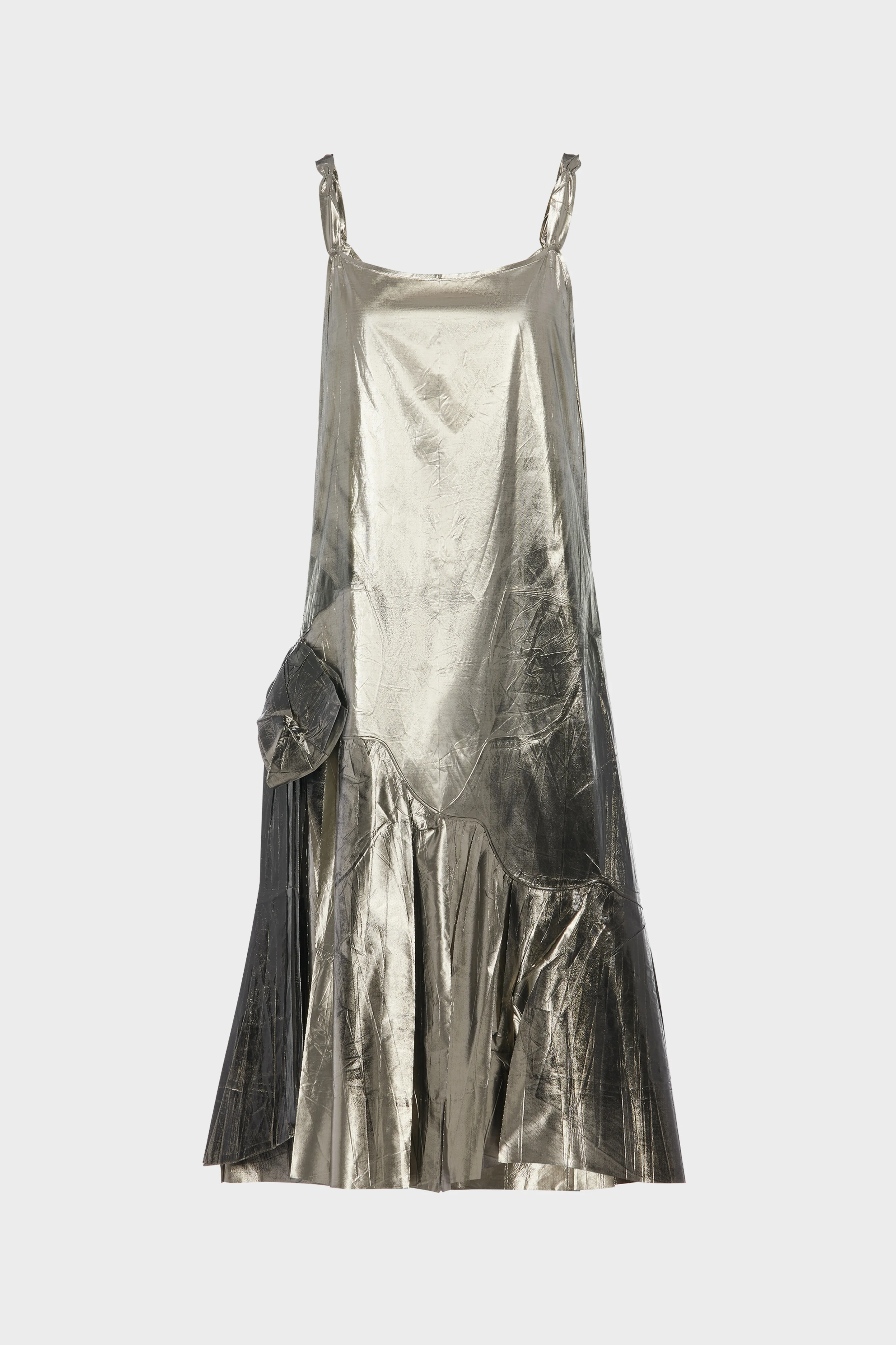 Crafted from metallic lame, this midi dress reflects the Pressed and Foiled technique explored in the collection. The lightweight fabric catches the light to reveal texture and depth, transforming surface into structure. Designed with thin gathered straps and a pleated hem and side bow for a festive finish. At the back, the Maison’s signature four stitches appear; the opposite of a label. Product Details Item ID S51DD0052M35755961 Primary fabric: 100% polyester Coating: 100% polyurethane Poly metallic lame Midi length Sleeveless design Scoop neck No visible closure Four stitches at the back Made in Italy