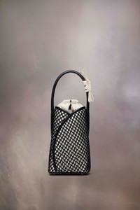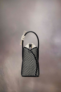 At once deconstructed yet complete, the vertical Fortune bag is crafted from net, toile and calf leather. The short rounded handle is wrapped in the contrast toile, elevating the humble everyday fabric as part of the Maison’s Exercise in Style study. Studs on the base allow the bag to stand, with a drawstring to securely close. Maison Margiela's signature, the four stitches, appear at the side; the opposite of a label. Product Details Item ID SB1WD0041P7270HA758 Body: 100% Viscose-Rayon Contrast: 100% Calf Leather Application: 100% Cotton Inside: 50% Polyamide-Nylon 50% Polyurethane Lining: 100% Cotton Inside: 100% Calf Leather Metallic hardware Handbag in net, toile and calf leather Tie closure Inside logo stamping Inside pocket Clean with a gentle cleaner Made in Italy