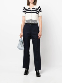 tailored wool trousers Highlights - Four-stitch wool trousers from maison margiela featuring navy blue, wool, signature four-stitch logo, straight leg, high-waisted, pintuck detailing, concealed front fastening, belt loops, two side welt pockets and rear button-fastening pocket. Made in Italy Composition Lining: Cotton 100%, Viscose 100% Outer: Wool 100% SIZE & FIT Model measurements Height 5 ft 10 in(1.77 m) Bust/Chest 35.03 in(89 cm) Hips 35.03 in(89 cm) Waist 23.62 in(60 cm) Measurement INSIDE LEG 31.1 in(79 cm) HIPS 35.43 in(90 cm) WAIST 27.55 in(70 cm) FittingInformation This piece fits true to size. We recommend you get your regular size Designed to be fitted at the waist and hips, loose over the leg Made with a mid-weight non-stretch fabric Washing instructions Dry Clean Only