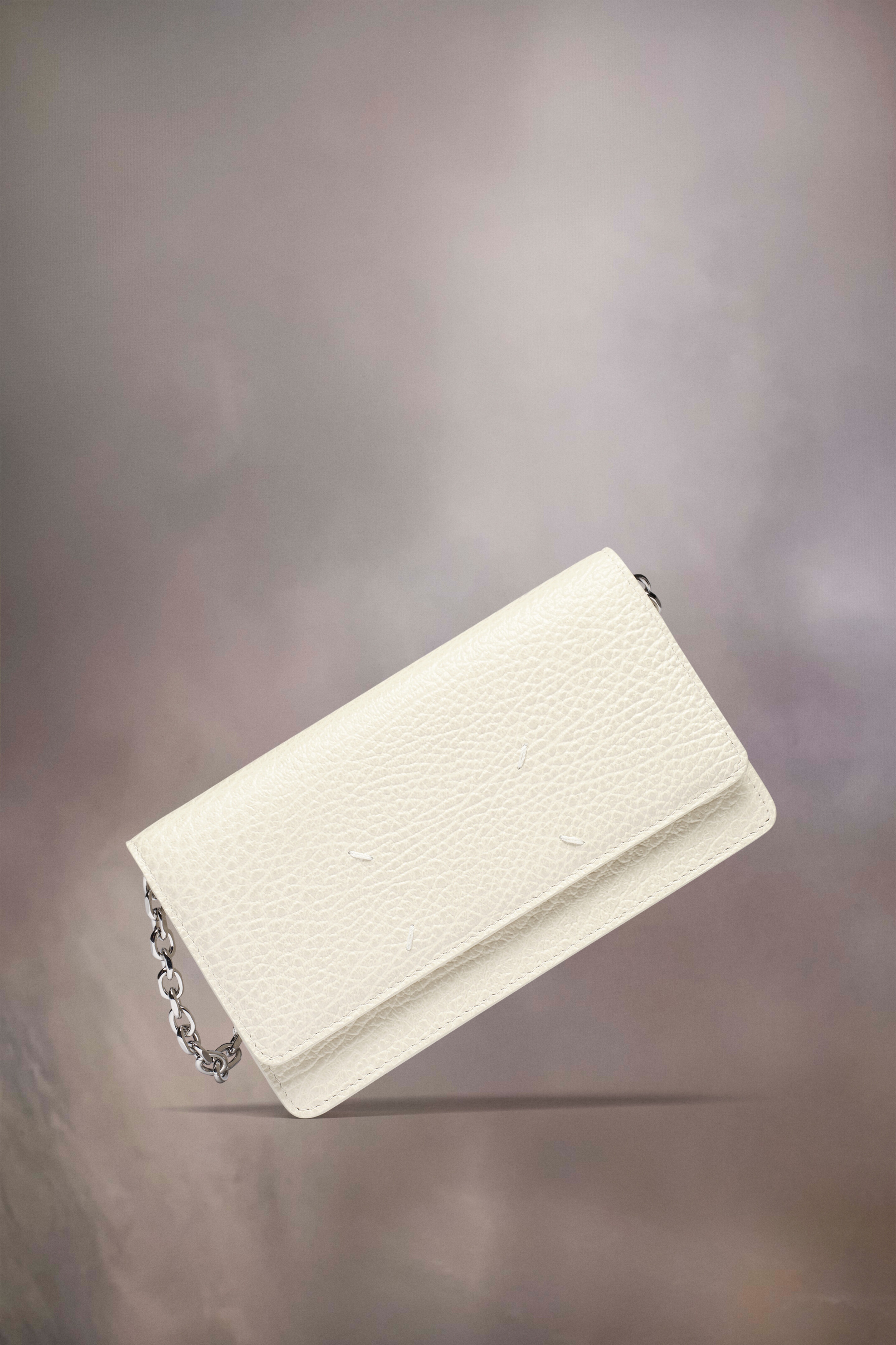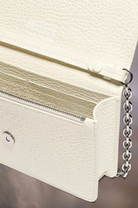 In embossed grainy leather with a chain, the wallet has a snap button closure and zipped inner section. It features the numeric logo inside. Maison Margiela's signature, the four stitches, appear on the flap; the opposite of a label. Product Details Item ID SA3UI0008P4455H9677 Outer: Grainy calf leather with soft touch Inside: Calf leather Lining: Viscose Removable chain and leather strap Four stitchesat the front Magnetic button closure Flat pocket at the back Inside logo stamping Inside zip pocket Inside flat pockets Clean with a specific leather cleaner product and a humid microfiber cloth Made in Italy 19 cm x 4 cm x 11 cm/7,5 in x 1,5 in x 4,5 in (Length x Width x Height) Shoulder strap drop: 53 cm/20,8 in