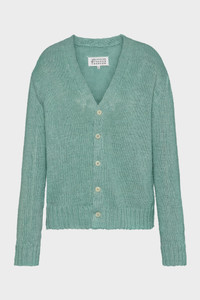 Part of the Gardening Hemp group, the acetate knit cardigan comes in authentic hemp yarn with a summery feel. It features long sleeves, buttons and a V-neck design. The cuffs and wide hem are ribbed for further texture. Maison Margiela's signature, the four stitches, appear at the back; the opposite of a label. Product Details Item ID S51HP0017M13100545 Primary Fabric: 100% True Hemp Hemp cardigan V-neck Button-up placket Long sleeves with ribbed cuffs Ribbed hem Four stitches at the back Model is 178 cm tall and wears a size S.