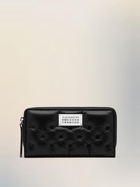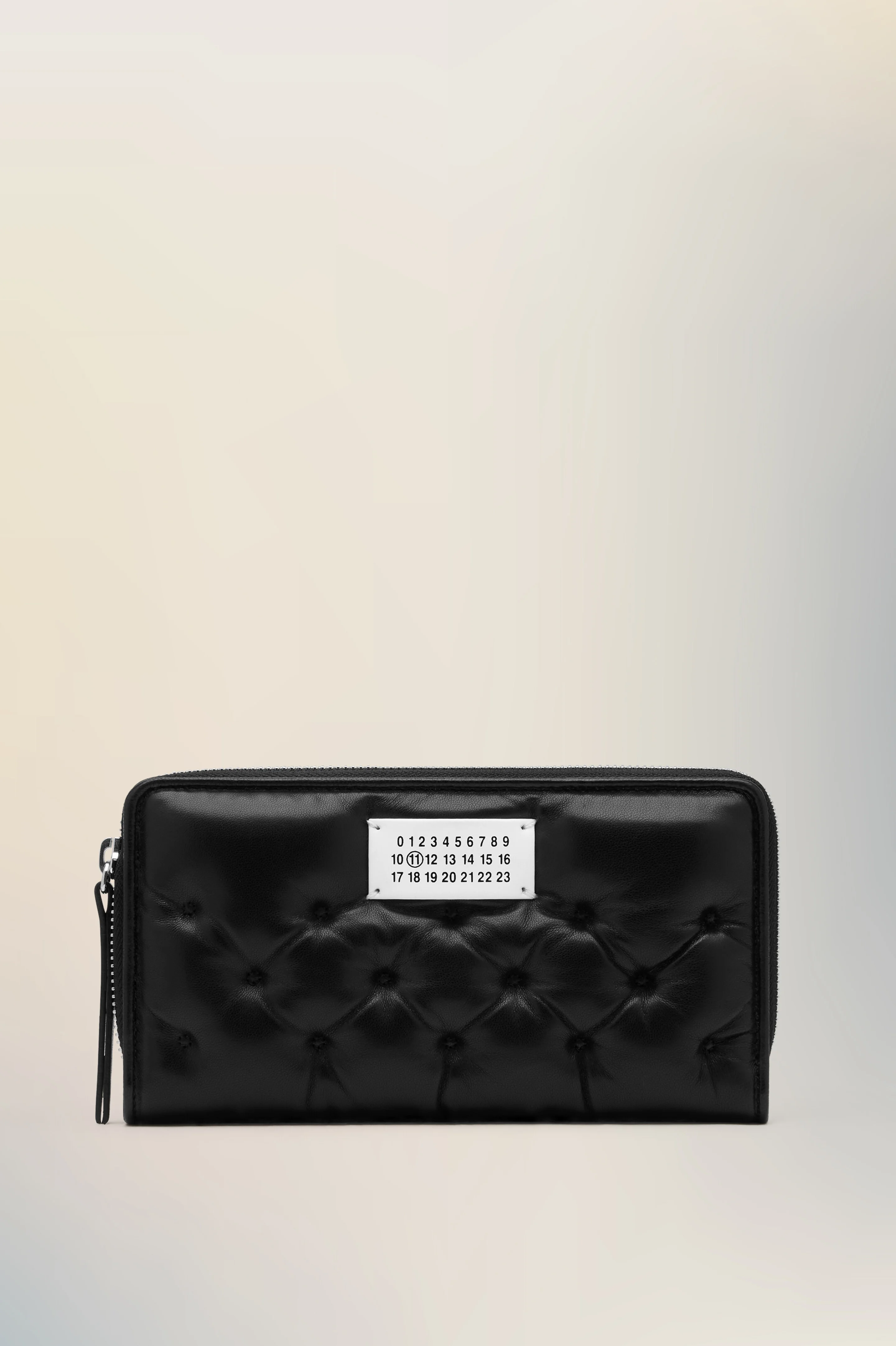 Constructed in embroidered quilted nappa leather, the Glam Slam wallet recalls the notion of unconscious glamour and evokes its association to ease, following the study into dressing and travelling rituals worldwide. The Glam Slam debuted in the SS18 show and has a quilted design which mimics matelassé – the style of hand-stitched quilts created in Marseilles, France. The zip-around design features supple rounded edges, zipped inner section and the Maison’s numeric logo tab. Product Details Item ID SA1UI0030P6434T8013 Body: 100% ovine leather Lining: 100% viscose Embroidered nappa leather wallet Logo label on the front Zip closure Logo stamp inside Zip pocket inside Internal flat pockets Made in Italy 19 cm x 2 cm x 11 cm/7,5 in x 0,8 in x 4,3 in (Length x Width x Height)