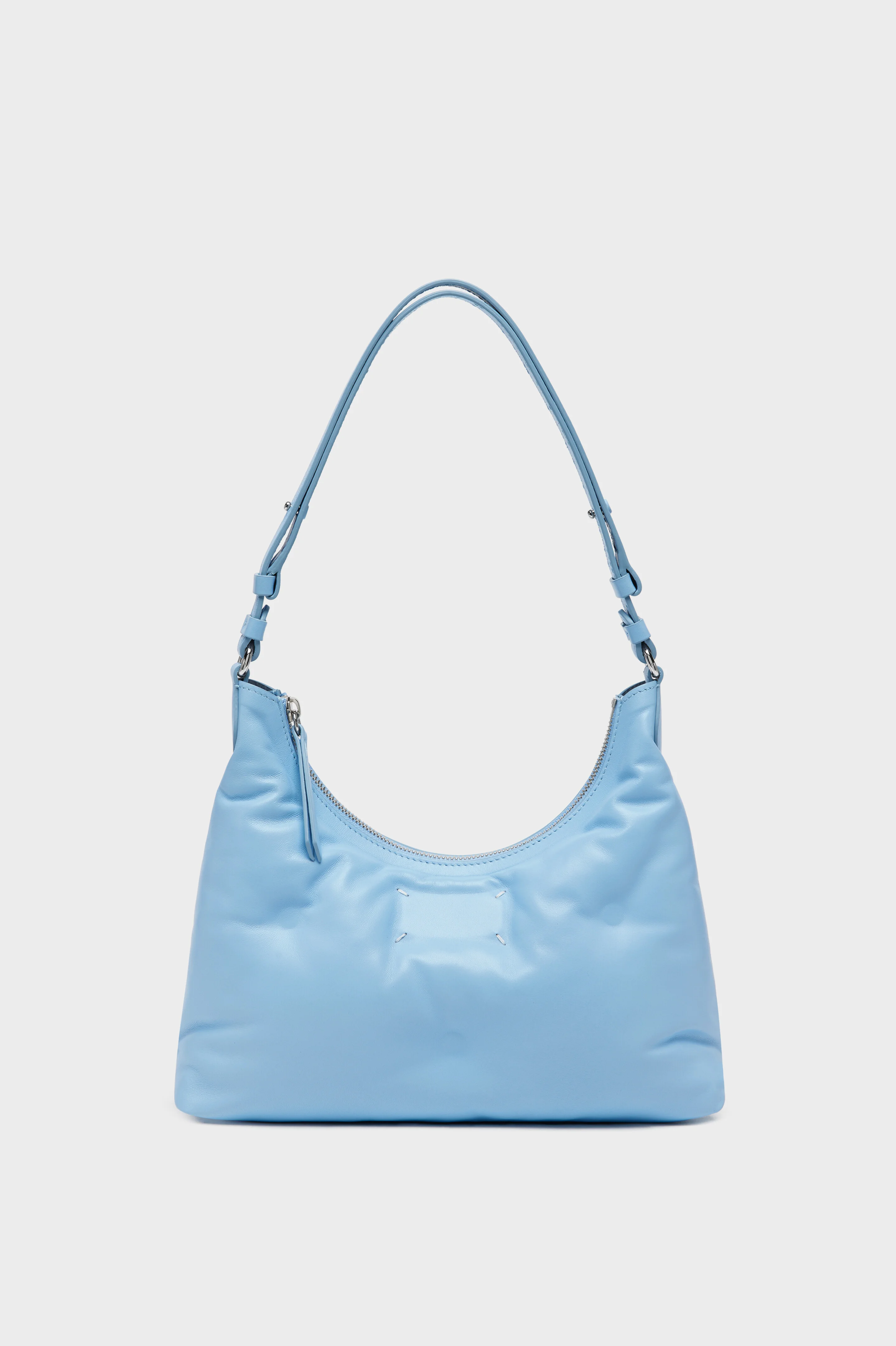 This bag interprets the Maison’s concept of unconscious glamour through a softly rounded hobo silhouette. Crafted in quilted nappa leather, the padded construction echoes matelasse — the hand-stitched quilting tradition of Marseilles, France — first introduced with the Glam Slam in the SS18 show. Designed to be carried by hand or worn over the shoulder, it offers a relaxed yet considered form. At the front, Maison Margiela’s signature, the four stitches, appear; the opposite of a label. Product Details Item ID SB3WG0024P8840T6388 Body: 100% ovine leather Lining: 100% polyester Inside: 100% ovine leather Metallic parts: 100% zinc Metallic parts: 100% brass Quilted nappa leather Adjustable shoulder strap Zip closure Four stitches at the back Inside logo stamping Made in Italy