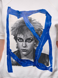 MAISON MARGIELA sweater in white, printed graphic, crewneck, short sleeves, branded sleeve, relaxed fit. Made in Portugal Standard Sizing 100% Cotton Model is 5'9" wearing size XS. Bust: 33" Waist: 24" Hip: 33"