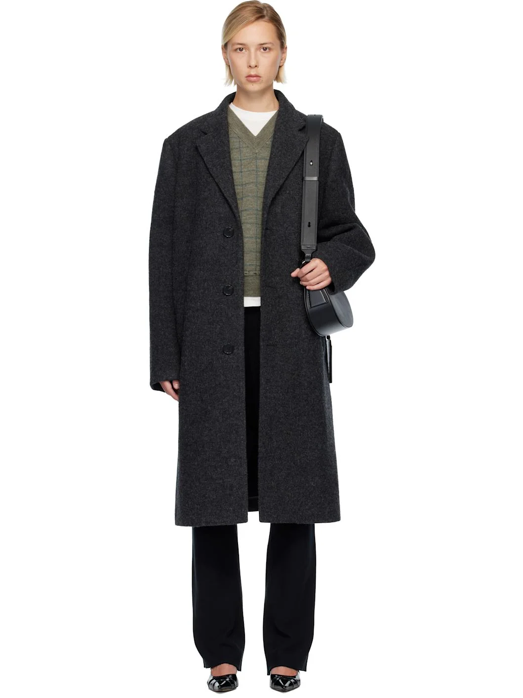 Nylon- and virgin wool-blend melton coat. · Notched lapel · Button closure · Welt pockets · White stitching at back collar · Central vent at back hem · Welt pockets at interior · Partial satin lining Supplier color: Melange carbon Body: 55% nylon, 45% virgin wool. Trim: 100% cotton. Lining: 63% acetate, 37% viscose. Made in Italy 252168F059000