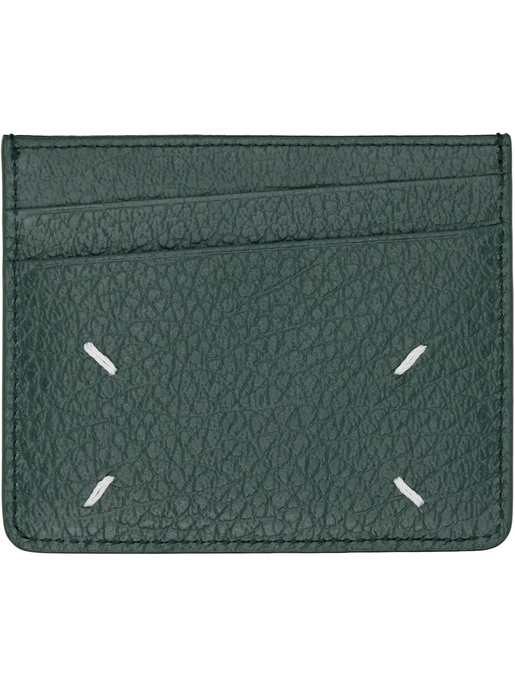 Grained calfskin card holder. · White stitching at face · Five card slots · Central note slot · H3.25" x W4" Supplier color: Bottle green Calfskin. Made in Italy 261168F037001
