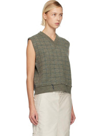 Knit virgin wool vest. · Jacquard check pattern throughout · Rib-knit V-neck and hem · Whipstitching and raw edge at hem · Loose thread detailing at hem and side · White stitching at back collar Supplier color: Military green 100% virgin wool. Made in Italy 252168F100001