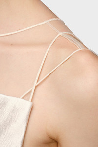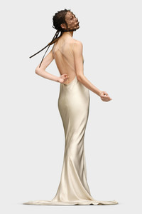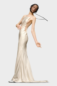 In hammered satin, this maxi dress which pools on the floor, follows a sleeveless design with a boat neck. Sheer panelling features at the chest and around the back, with a large cut-out. It's finished Four white stitches show showing the hand of the Maison: the opposite of a label. Product Details Item ID SI0CT0007S49465102 Composition: 52% Viscose, 48% Acetate Hammered satin evening dress with transparent organza details Round neck Sleeveless Flared silhouette with train Bare back opening with button closure Made in Italy The model is 178cm tall and wears a size 40.