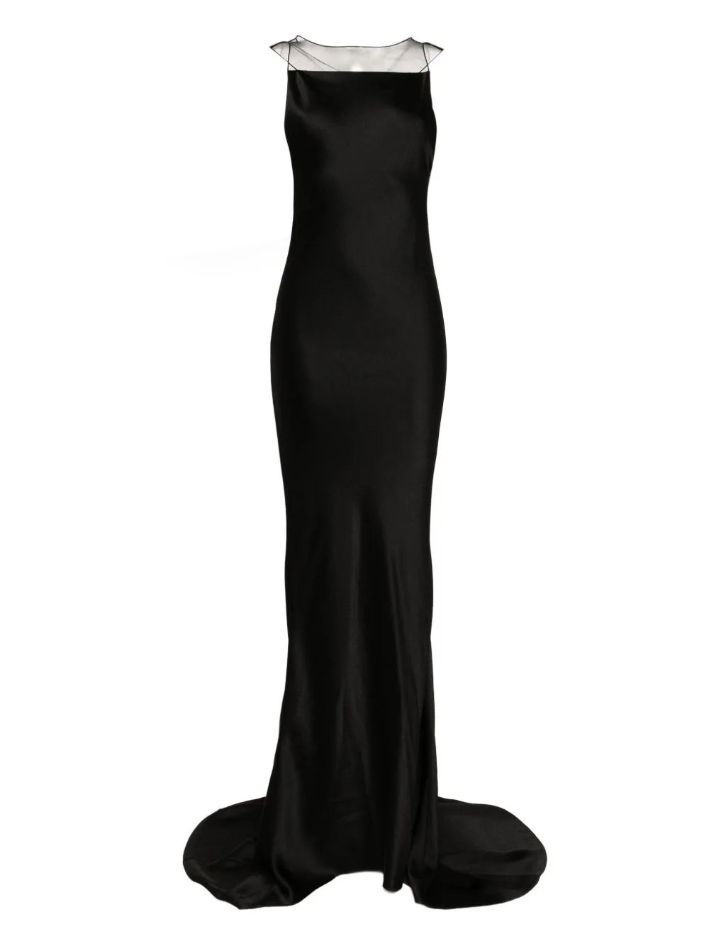 Hammered satin gown Highlights - Black - Rear button fastening - Sleeveless Made in Italy Composition Viscose 52%, Acetate 48% SIZE & FIT Model measurements Height 5 ft 10 in(1.77 m) Bust/Chest 30.31 in(77 cm) Hips 34.25 in(87 cm) Waist 25.19 in(64 cm) FittingInformation Designed for a slim fit that sits just away from the body offering a close yet comfortable fit Particularly long in length; consider your own measurements Made from a lightweight non-stretch fabric Washing instructions Dry Clean Only