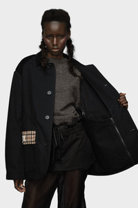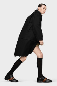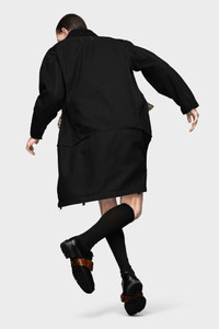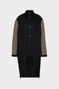 Crafted from heavy cotton with wool sleeves, the coat can be worn in its knee-length design with contrast panel or worn in a jacket silhouette by folding with zips. It has a chest pocket and flap pockets as well as a collar and button fastenings. Maison Margiela's signature, the Four stitches, appear at the back; the opposite of a label. Product Details Item ID S51AA0352S53229900 Primary fabric: 50% wool, 50% cotton Secondary fabric: 90% wool, 10% nylon Heavy cotton coat with wool sleeves Pointed collar Button and zip closure The coat can be fold-up for a double fit Four stitches at the back Made in Italy Model 1 is 5'8'' tall, model 2 is 6'1" tall and they wear a size 40.