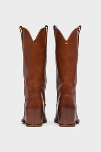 An archival reference, the heel-less western boot is defined by a continuous curved sole that encases a hidden heel. The leather upper is treated to create a worn, lived-in surface. A pointed toe and clean seam construction keep the silhouette precise. At the back, the Maison’s single white stitch marks its signature. Product Details Item ID S39WW0081P7677T2229 Upper: 100% calf leather Lining: 100% calf leather Inside: 100% calf leather Sole: 100% calf leather Contrast: 100% rubber Pointed toe boots in smooth leather Curved wedge heel Made in Italy