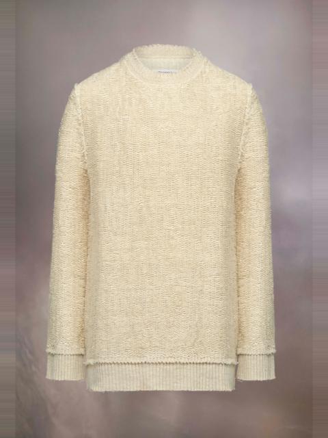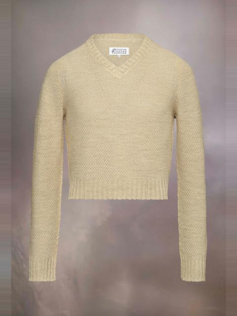 In hemp basket weave, the knitted cardigan features a crew-neck and ribbed trims, with two front pockets. Maison Margiela's signature, the four stitches, appear at the back; the opposite of a label. Gauge 5.
