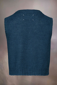 In hemp basket weave, the knitted sleeveless sweatshirt features a V-neck and ribbed trims. Maison Margiela's signature, the four stitches, appear at the back; the opposite of a label. Gauge 5.
