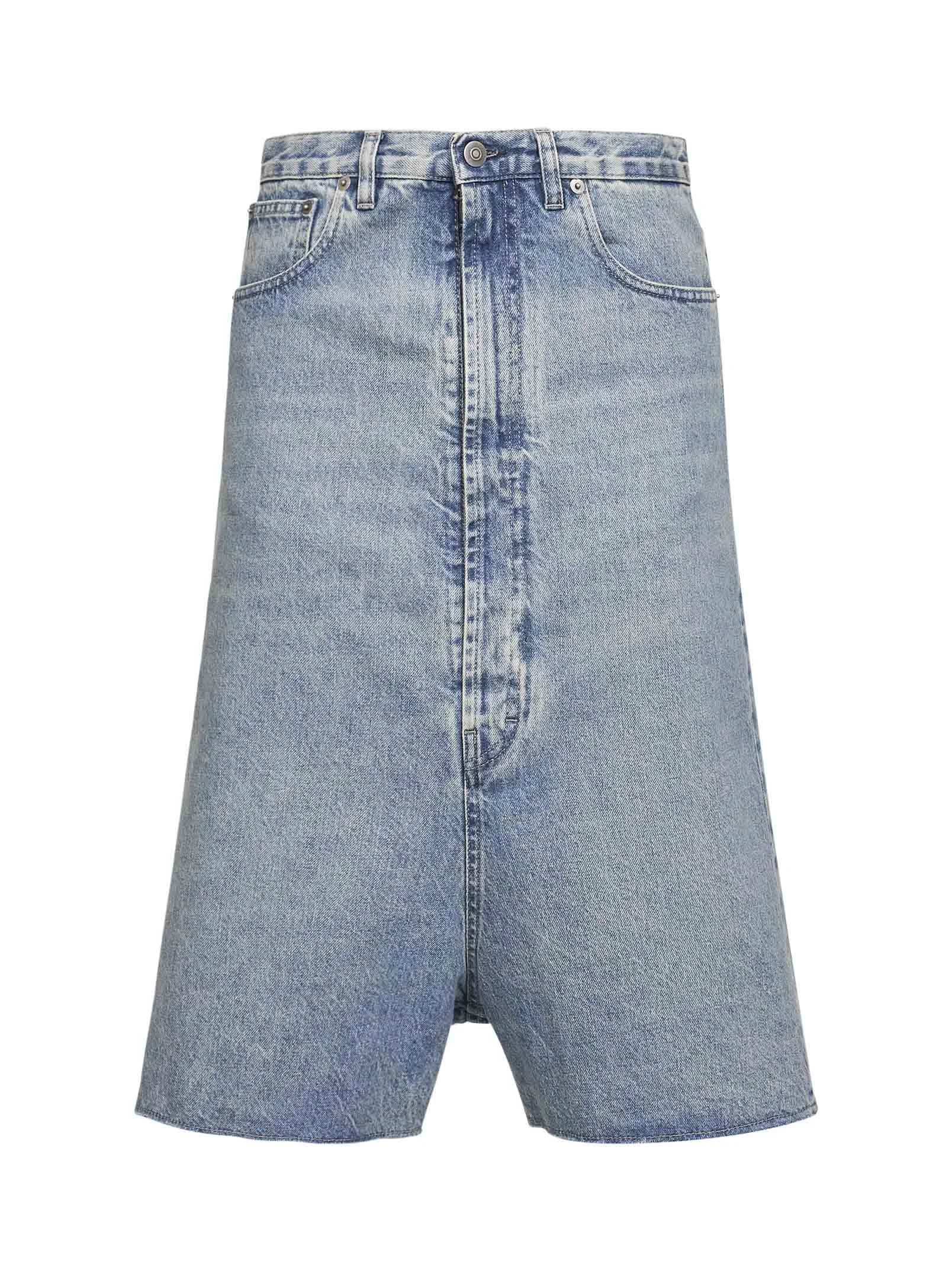 - Front long zip-fly closure, metal logo button - Waist with belt loops; exaggerated dropped crotch - Five-pocket model - Four stitches at back - Frayed hems - Below-the-knee length - Ice blue color - 100% cotton - Made in italy Natural (Veg): Cotton100 % Made in: Season: P26 S67MU0065M30066962