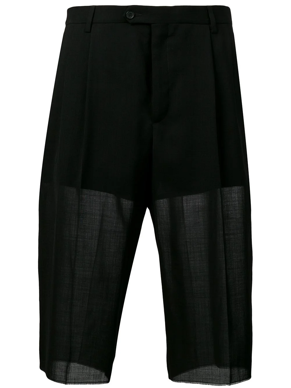 knee-length shorts Deconstructed and avant-garde, Maison Margiela's pared-back aesthetic is showcased with these black silk blend knee-length shorts. Featuring a button and zip fly, side pockets, belt loops, a rough frayed hem, back welt pocket and diaphanous fabric above the knee. Made in Italy Composition Lining: Cupro 51%, Silk 49% Outer: Virgin Wool 85%, Polyamide 15% SIZE & FIT Model measurements Height 5 ft 10 in(1.78 m) Bust/Chest 33.46 in(85 cm) Hips 36.22 in(92 cm) Waist 23.22 in(59 cm) Washing instructions Dry Clean Only