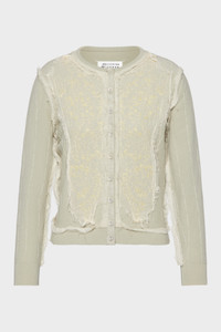 This cardigan is framed by contrast, with applique patches that resemble the reverse side of delicately embroidered fabric. Vertical stitch lines mirror the inside of a garment, aligning with the Maison’s decortique approach. Maison Margiela’s signature, the four stitches, appear at the back; the opposite of a label. Product Details Item ID S51HP0022M13153688 Primary Fabric: 100% Virgin Wool Secondary Fabric: 54% Acetate 26% Polyamide-Nylon 20% Silk Secondary Fabric: 100% Cotton Fitted wool cardigan Overlay with raw-edged embroidered panels Button-through front Ribbed cuffs and hem Four stitches at the back Made in Italy