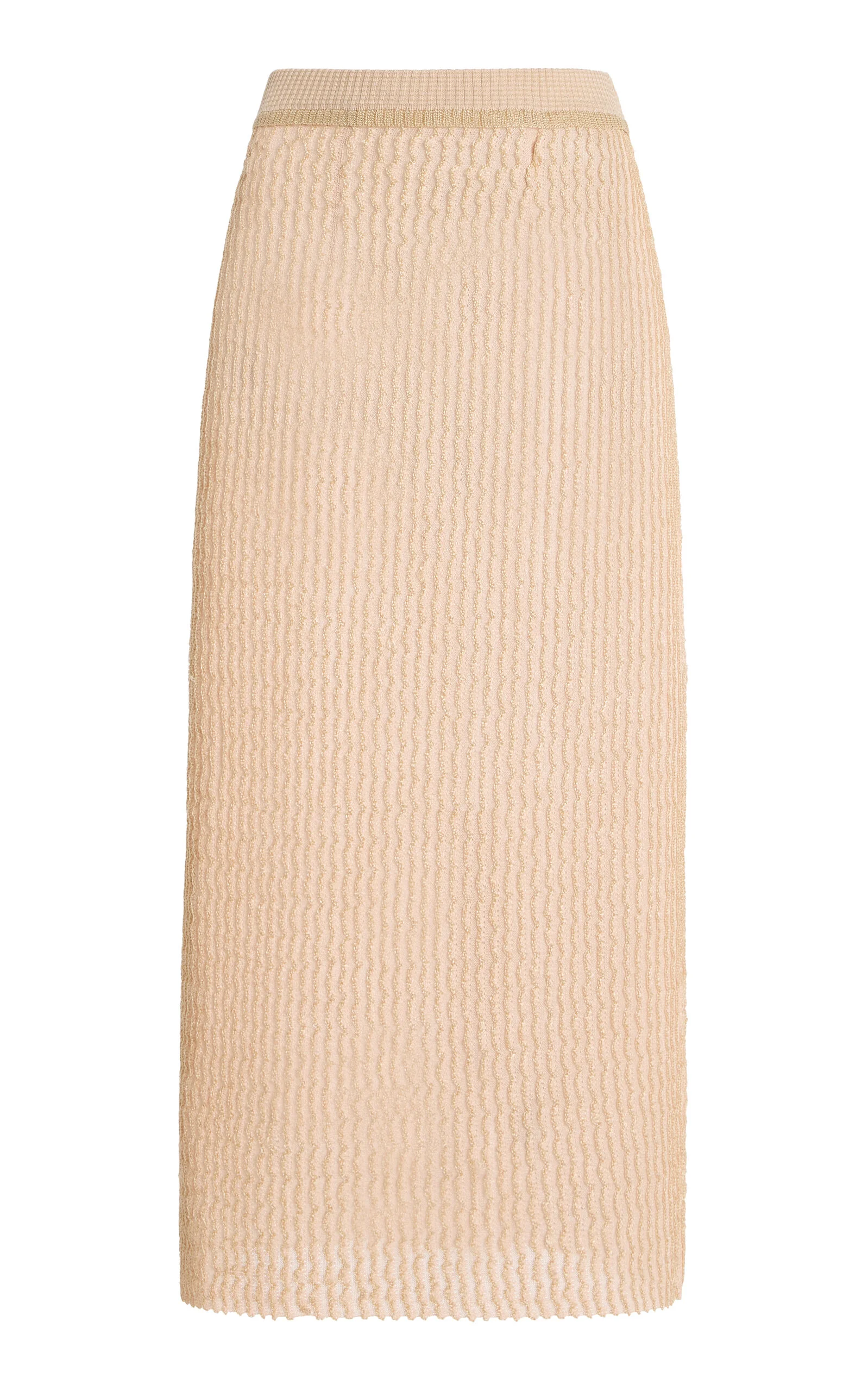 Radical conceptual designer Martin Margiela founded his eponymous couture house in 1988 and quickly established himself at the forefront of the Belgian fashion avant-garde. This calf-length skirt has a column silhouette made from a slightly sheer textured knit. It's finished with signature pick-stitching at the back. PRODUCT DETAILS - Resort '26 - Pull on - Composition: 59% polyester, 41% viscose-rayon - Dry clean - Made in Italy SIZE & FIT - Our model is wearing a size Small - Model is 5'10" with a 34" bust, 24" waist, and 35" hip
