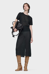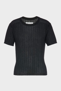 A lightweight knit top woven in a sheer rib, combining a close fit with understated texture. Short sleeves and a classic crew neckline refine the silhouette, while its translucent surface recalls the Maison’s deconstructive ethos. At the back, the Maison’s signature four stitches appear; the opposite of a label. Product Details Item ID S51HL0033M13237900F Primary fabric: 59% polyester 41% viscose-rayon Gauge 14/knitted frills Short sleeves Round neck Four stitches at the back Made in Italy