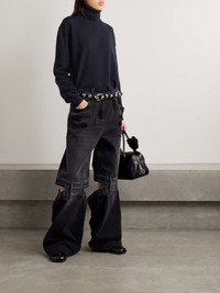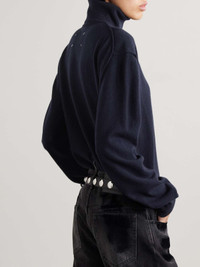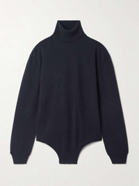 Maison Margiela’s bodysuit creates the illusion of a perfectly tucked in turtleneck sweater. It’s made from soft wool and cashmere-blend and has raised seams and a relaxed fit. Large to size. See Size & Fit notes. Size & Fit - Fits large to size, take one size smaller than normal - Designed for a relaxed fit - Minimal brief coverage - Mid-weight, non-stretchy fabric - Model is 180cm/ 5’11” and is wearing a size XSmall Model measurements: - Bust: 79cm/ 31” - Waist: 61cm/ 24” - Hip: 89cm/ 35” Details & Care - Midnight-blue wool and cashmere-blend - Snap fastenings at base - 70% wool, 30% cashmere - Dry clean