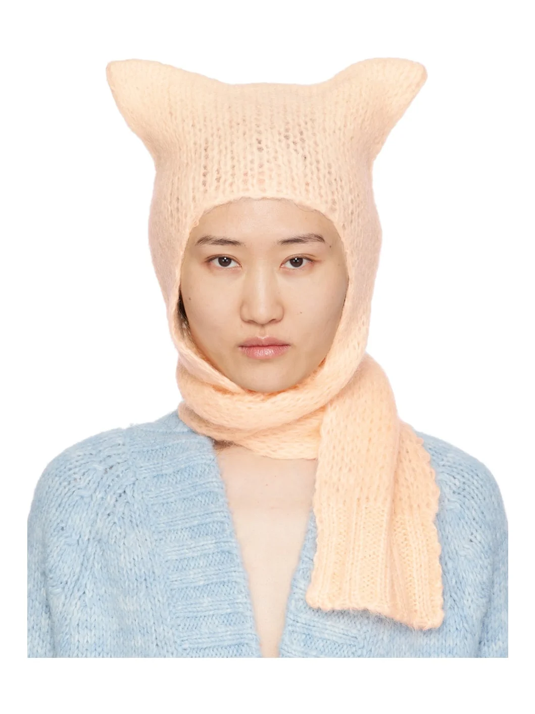 3-gauge hand-faded knit mohair-blend beanie in pink. · Extended scarf-style self-tie ear flaps · Rib knit trim at ear flaps · White stitching at back face Supplier color: Apricot