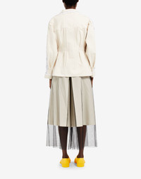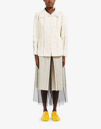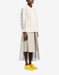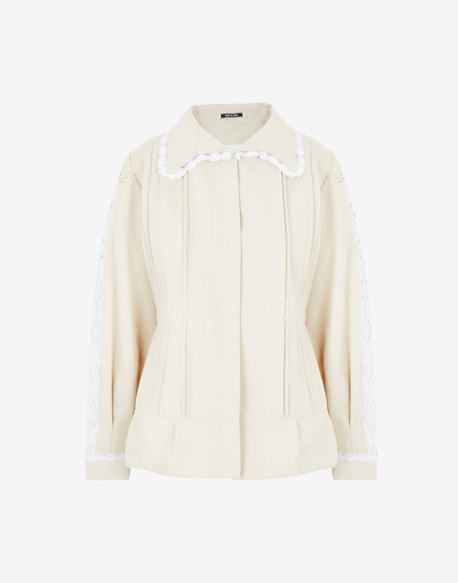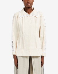 Cotton canvas jacket following a 1940's design with an embroidered lace collar hem and lace details to the sleeves. With pleats to front and back and hidden snap-button closure. Made in Italy. Item details 100% Cotton Lace Canvas Classic Neckline Long sleeves Snap buttons fastening Unlined