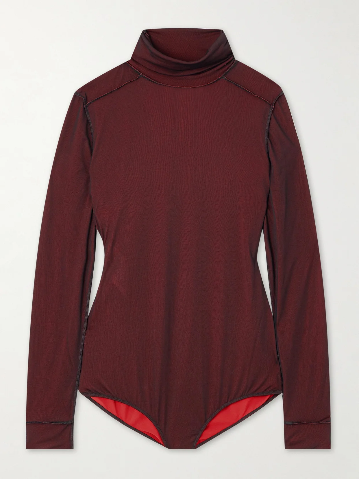 Maison Margiela's bodysuit is made from vibrant, red jersey with a sheer black overlay that creates the illusion of a dark sheen. Designed for a figure-skimming fit with a rolled turtleneck, it has subtle distressing at the exposed reverse seams.
