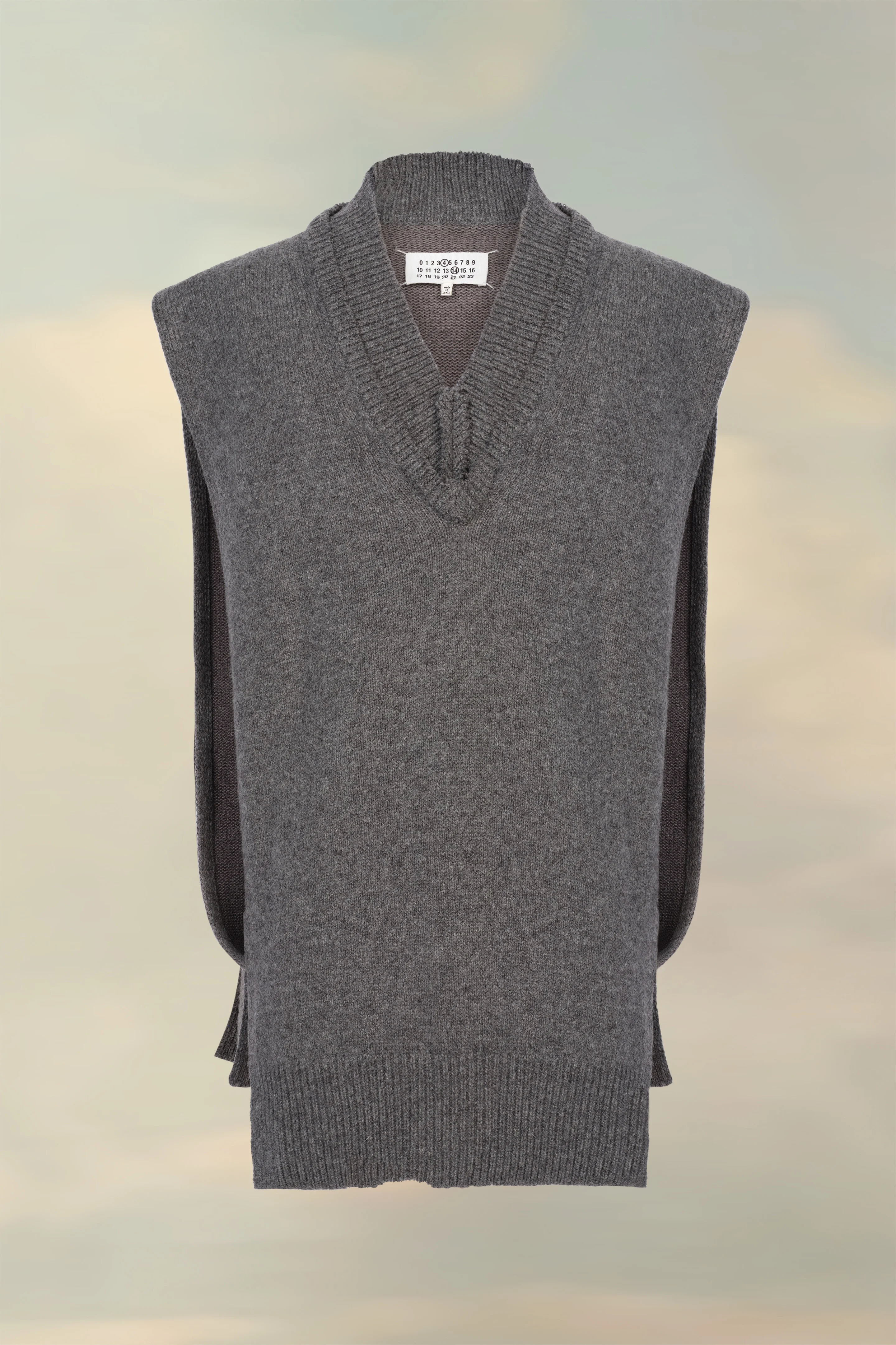 This oversized knit vest in jersey has a layered V-neck and ribbed trims for added texture. At the back, four white stitches show the hand of the Maison: the opposite of a label. Gauge 5. Product Details Item ID SI1TH0001S18064860F Composition: 46% Wool, 31% Linen, 23% Cotton V-neck vest Ribbed trims Décortiqué details Four stitches at the back Gauge 5 Made in Italy