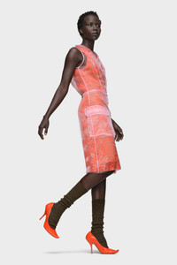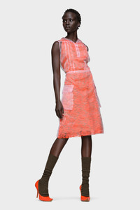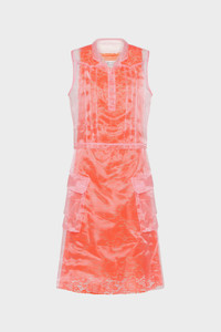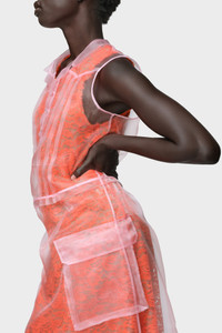This tea dress is composed in delicate layers of cotton lace and sheer organza. It features pin tucks at the bust, a flat collar, and a tab button-up neckline – details that echo traditional shirting. Originally worn for afternoon tea in the 1920s–1940s, the silhouette is reimagined here in weightless form. Maison Margiela’s signature, the four stitches, appear at the back; the opposite of a label. Product Details Item ID S51DD0048MTN104396 Primary fabric: 100% polyester Secondary fabric: 77% cotton, 23% polyamide Sleeveless dress in sheer polyester organza with lace underlayer Layered construction with flared skirt Pointed collar and partial button placket Two front flap pockets Four stitches at the back Made in Italy