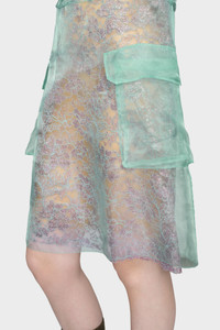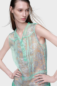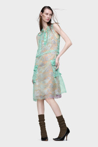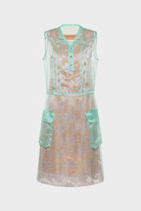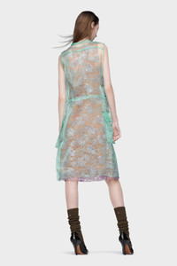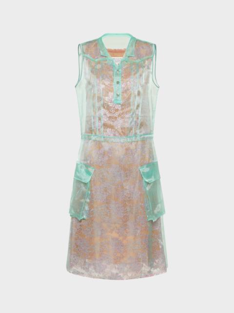 Maison Margiela reinterprets the tea dress as a layered study in light and texture. Originally worn for afternoon tea in the 1920s-1940s, sheer fabric floats over the garment, revealing its construction and shifting the perception of softness. Patch pockets and button details lend a subtle uniform sensibility. The four stitches appear at the back; the opposite of a label. Product Details Item ID S51DD0048MTN114642 Primary fabric: 100% polyester Secondary fabric: 43% polyester, 21% viscose, 21% cotton, 15% polyamide Sleeveless dress in sheer polyester organza with lace underlayer Partial button placket at the front Fitted bodice with flared skirt Patch pockets with flap closures at the hips Four stitches at the back Made in Italy