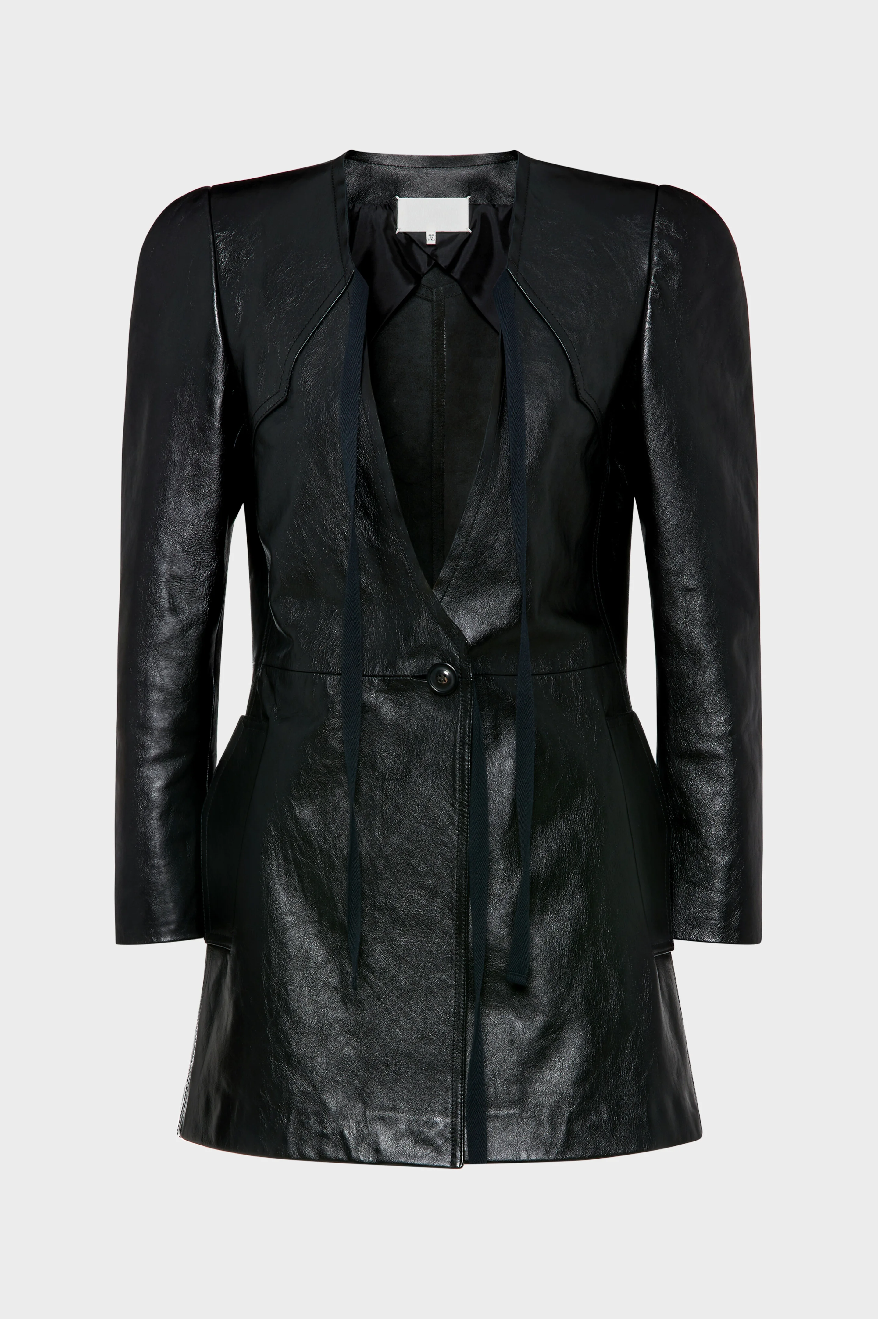This jacket is crafted in vintage leather with a deep V front and a single-button closure at the waist. The cut references archival pieces, where collars were removed to create raw-edged openings. Shaped with a clean, mid-length silhouette and finished with side pockets and a back vent. The front ties are a reference to the blouse blanche- the white lab coats worn by our team. At the back, the Maison’s signature four stitches appear; the opposite of a label. Product Details Item ID S29AM0407M07018900 Primary fabric: 100% calf leather Lining: 100% viscose-rayon Pocket lining: 100% cotton Long sleeves Round neck Front button and tie closure Four stitches at the back Made in Italy