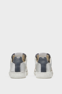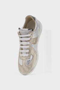 The Replica Iridescent sneakers are crafted in smooth calfskin and a glitter suede with a high-shine finish and iridescent coating that reflects coloured tones in the light. The Maison's iconic Replica sneakers are inspired by Austrian sports shoes from the seventies. Details on the Replica pairs are continually reworked in line with the season's inspirations. Product Details Item ID S39WS0130P7451HB123 Upper: 90% Polyester, 10% Polyamide Contrast: 100% calf leather Lining: 100% cotton Sole: 100% rubber Lace-up sneakers Maison Margiela logo label on the tab White stitching at the back Internal Replica label Internal elastic All-over Maison Margiela logo insole Made in Italy