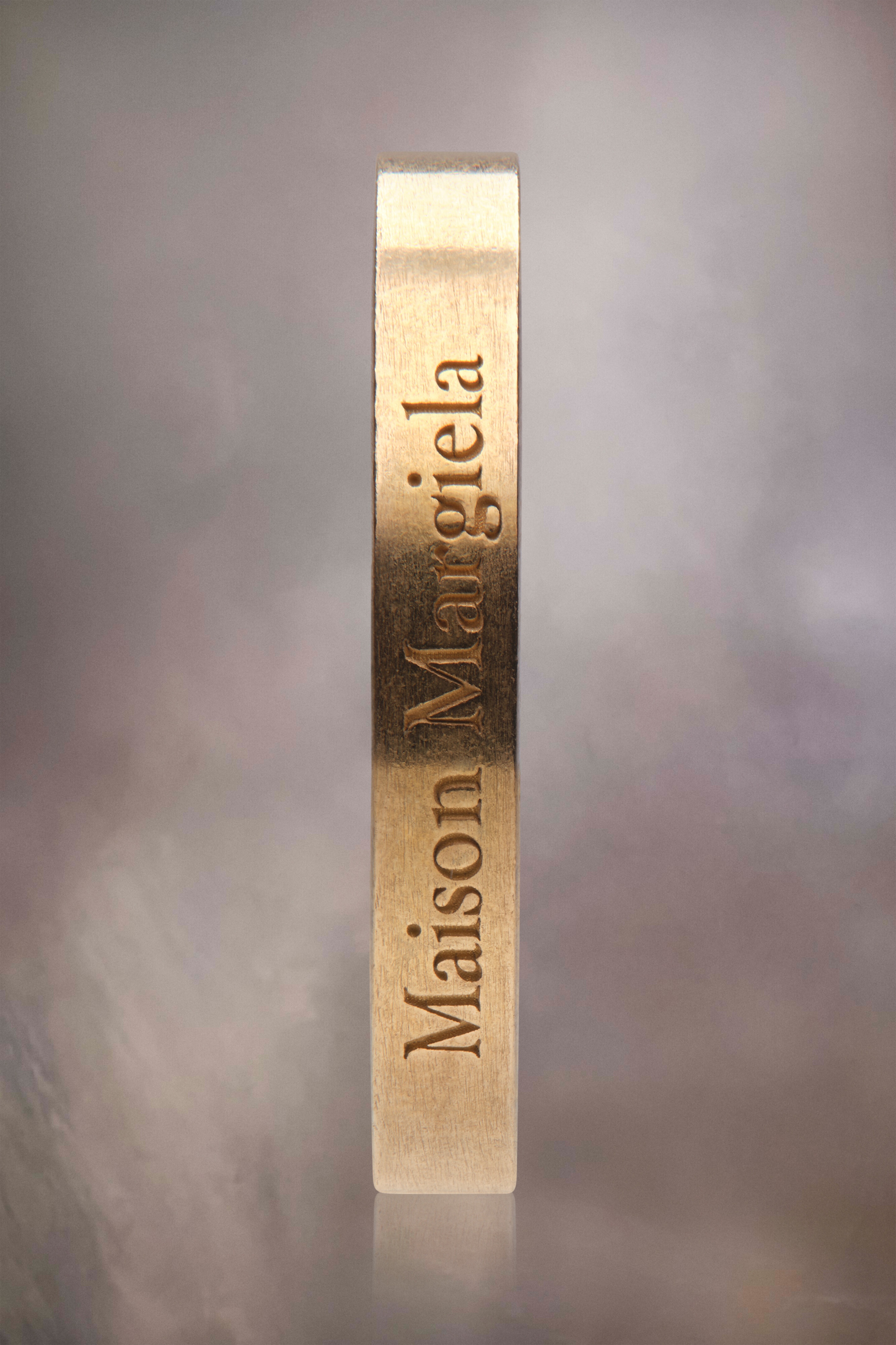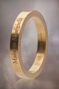 The 3mm ring with yellow gold plating, with an engraved Maison Margiela logo. Product Details Item ID SM1UQ0080SV0158950 Composition: 100% Silver Palladio burattato Tone on tone engraved brand logo Avoid salt, chlorine water and aggressive liquid Made in Italy Width: 3 mm