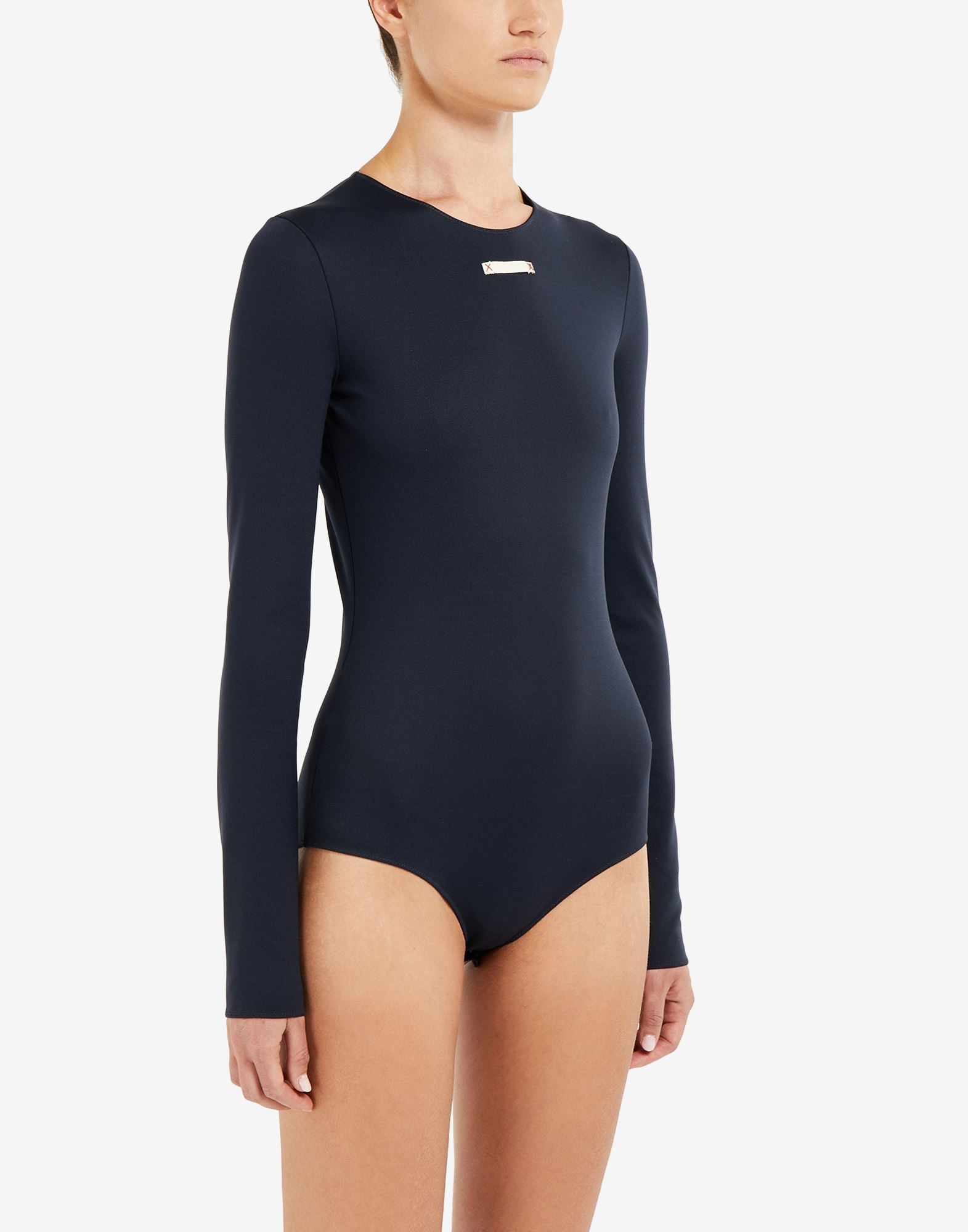 Stretch-jersey bodysuit with long sleeves and a round neckline. It features a label at the center front inspired from the school uniform tag. The Maison's iconic four white stitches adorns the back. Item details 85% Polyamide, 15% Elastane Jersey Logo Contrasting applications Round collar Long sleeves