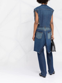 longline asymmetric denim vest indigo blue cotton slash neck sleeveless raw-cut edge front button fastening two chest flap pockets belt loops two side inset pockets two rear patch pockets asymmetric hem Made in Italy Composition Outer: Cotton 100% Lining: Polyester 65%, Cotton 35% SIZE & FIT Model measurements Height 5 ft 11 in(1.8 m) Bust/Chest 31.49 in(80 cm) Hips 35.82 in(91 cm) Waist 24.8 in(63 cm) FittingInformation This piece fits true to size. We recommend you get your regular size Cut for a loose fit Made with a mid-weight non-stretch fabric Washing instructions Machine Wash