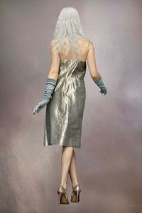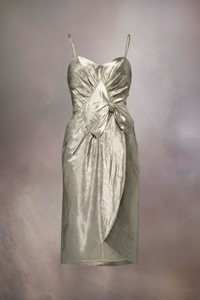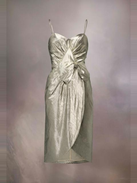In lurex fabric, the knee-length dress with spaghetti straps mixes ruching and draped design with an asymmetric hem revealing the lining. A bow embellishment appears at the waist and the back has a hidden zip fastening. Maison Margiela's signature, the four stitches, appear at the back; the opposite of a label. The model is 178CM tall. Model wears size 40.