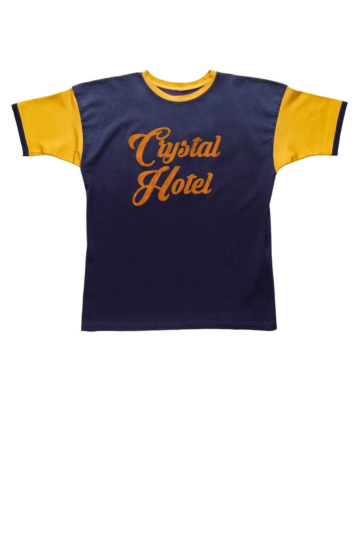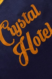 Maison Margiela Crystal Hotel two-tone tee features a crackled “Crystal Hotel” graphic at the front and the house’s signature four-stitch detail atop "City" at the back. Fit Notes: DETAILS contrasting panel sleeves Crystal Hotel text design crew neckline Material: Viscose 53%,Cotton 47% Made in Italy Product codes: - SKU: ESSX/MAS/AW25/S50GC0718S23988384/Purple/S - UPC: 8059039814357