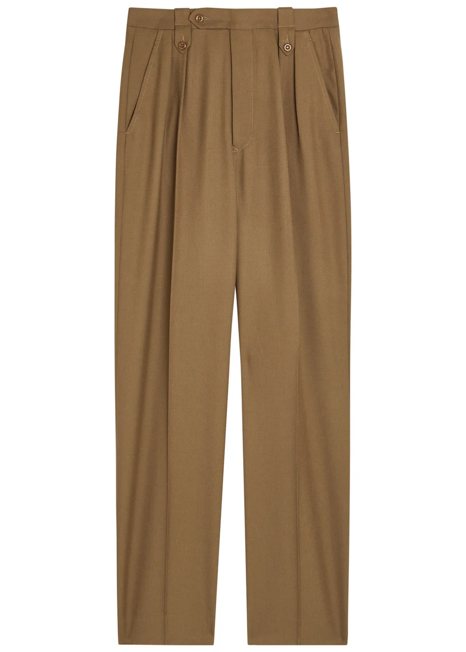 Info & Care Maison Margiela wool trousers Button-fastening tabs and pleats at waist, side slip pockets, pressed crease through legs, back flap pocket Concealed button, hook and zip fastening at front 100% virgin wool Dry clean Size & Fit Inside leg length: 32.5 inches/ 82.5cm Midweight Relaxed fit, tapers more towards cuffs Model is 5'10"/ 178cm and wears a size;IT40
