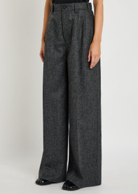 Info & Care Maison Margiela wool trousers Partially elasticated waistband, belt loops, pleats at waist, side slant pockets, pressed crease through legs, signature contrast stitching at back waist, back slit pockets Partially concealed button, zip and hook fastening at front 100% wool Dry clean Size & Fit Inside leg length: 32 inches/ 81.5cm Midweight Wide-leg;cut, tailored style Model is 5'9"/ 175cm and wears a size;IT40