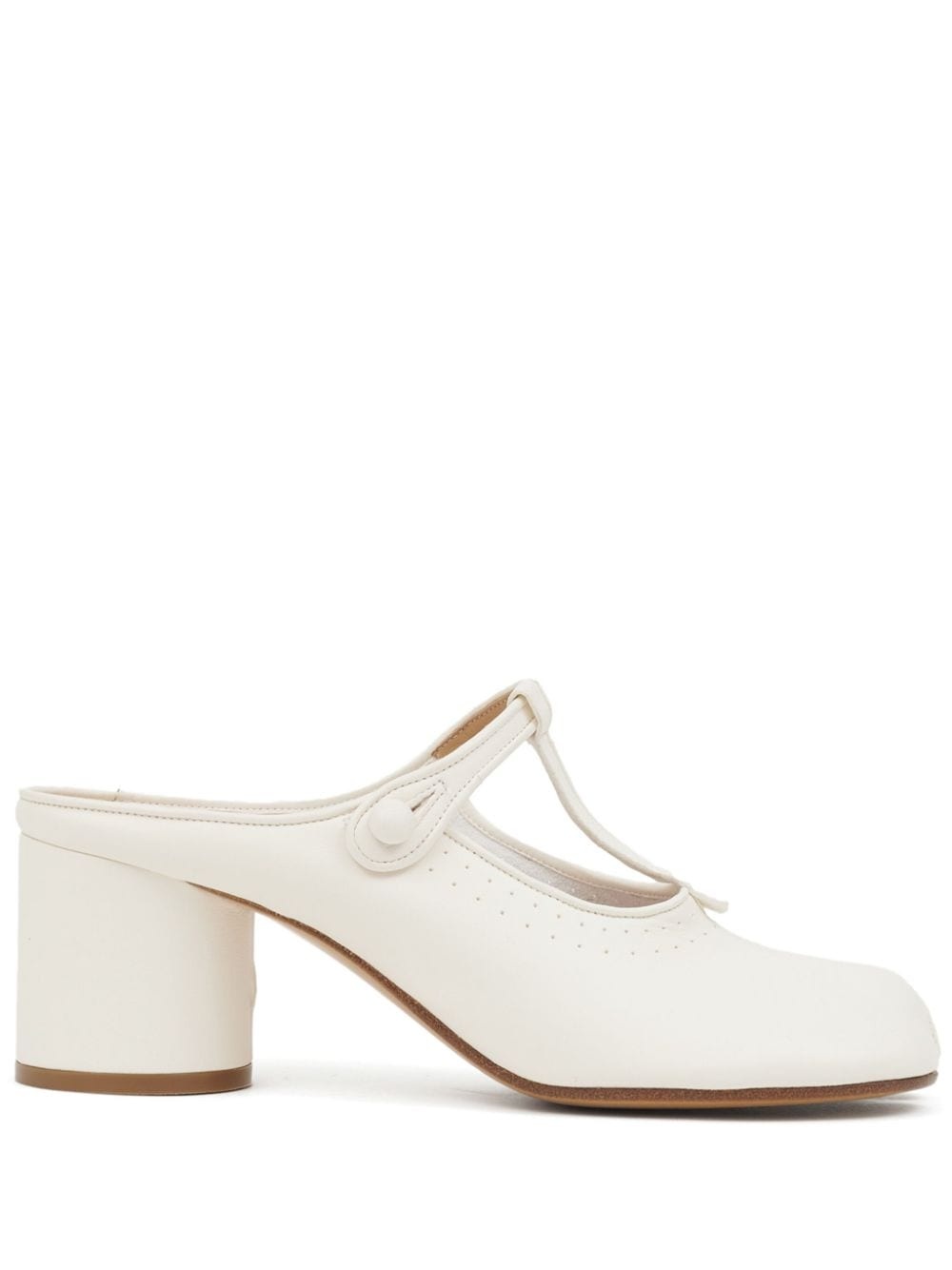 Tabi 60mm leather mules A retro-inspired take on a brand classic, these white Tabi mules by Maison Margiela combine the model's signature split-toe silhouette with a buttoned T-bar strap. Crafted from smooth leather, they're grounded on a chunky cylindrical heel. Highlights - White - Leather - Perforated detailing - Split toe - T-bar strap - Slip-on style - 60mm block heel - Leather sole Made in Italy Composition Lining: Calf Leather 100% Outer: Lamb Skin 100% Sole: Calf Leather 100%