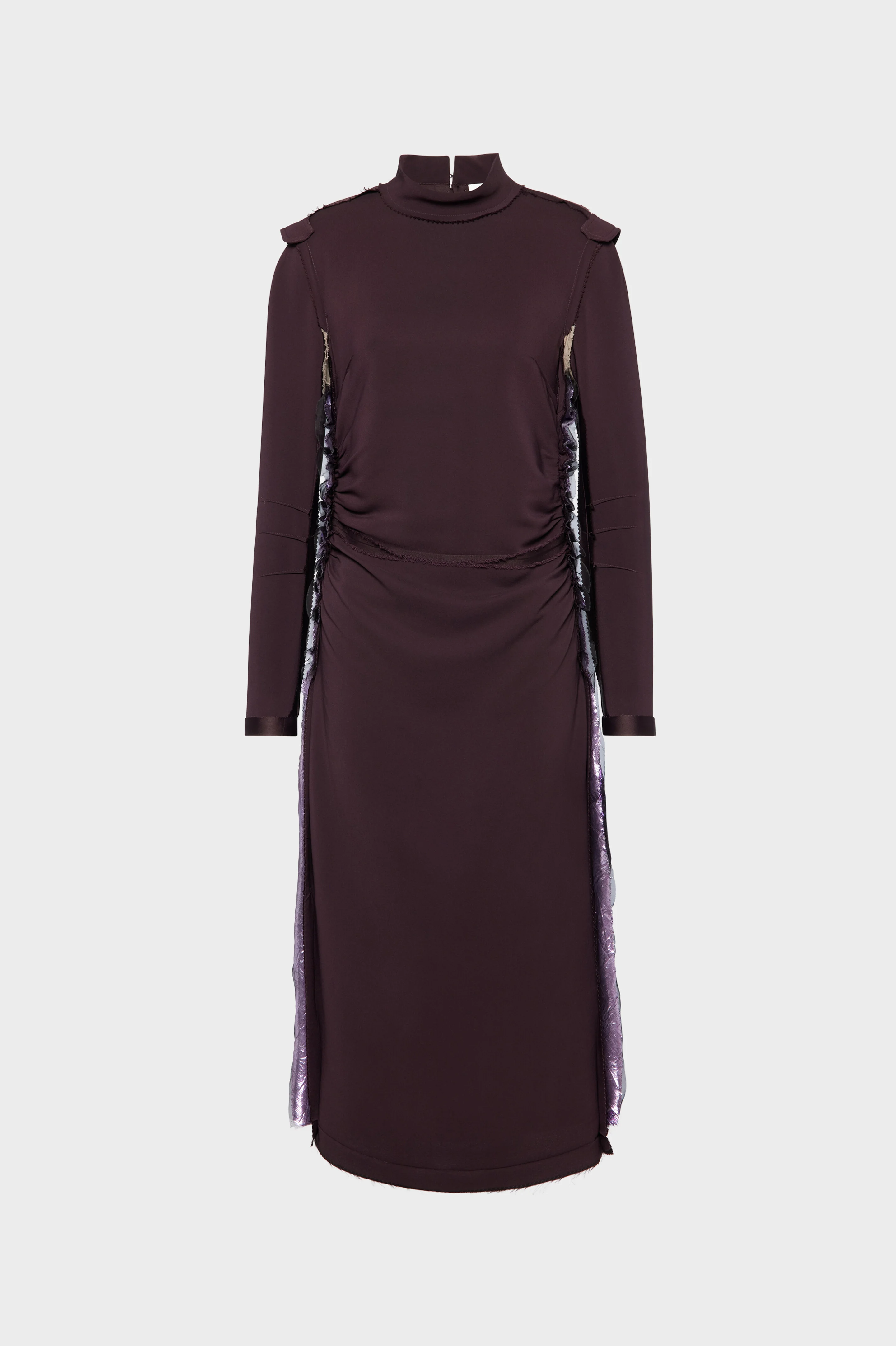 Cut in a sculpted silhouette, this long-sleeved dress reveals glimmers of a metallic lame along the side seams. Soft ruching through the body enhances the shape, while the contrast textures add subtle dimension. Maison Margiela’s signature, the four stitches, appear at the back; the opposite of a label. Product Details Item ID S51DD0043M35533358 Primary fabric: 76% acetate, 24% silk Secondary fabric: 54% polyester, 46% silk Tertiary fabric: 100% silk Long-sleeved dress in reverse satin with lame and silk inserts Mock neckline with visible shoulder pads Exposed seams and raw edges Lame and organza layers extend from the side panels Four stitches at the back Made in Italy