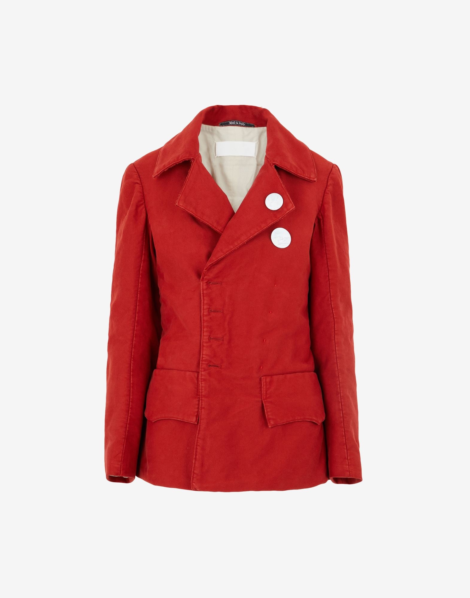 Stonewashed heavy cotton double-breasted jacket, inspired by military styles. It features a notched collar, 'Memory of' button holes and hidden snap-button closure with trompe l'oeil flap pockets. Made in Italy. Item details 100% Cotton Twill Lapel collar Brooch Solid color Two pockets Fully lined Hook-and-eye closure Rear slit