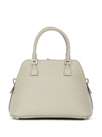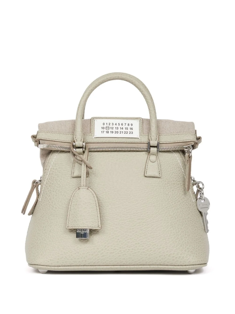 5AC Classique mini tote bag Highlights - Light beige - Calf leather - Pebbled texture - Logo charm - Number patch to the front - Key pendant - Foldover top - Zip fastening - Two rolled top handles Made in Italy Composition Lining: Polyester 100% Outer: Calf Leather 100% SIZE & FIT Measurement DEPTH 5.11 in(13 cm) HANDLE 8.26 in(21 cm) HEIGHT 7.08 in(18 cm) STRAP 17.32 in(44 cm) WIDTH 9.84 in(25 cm)