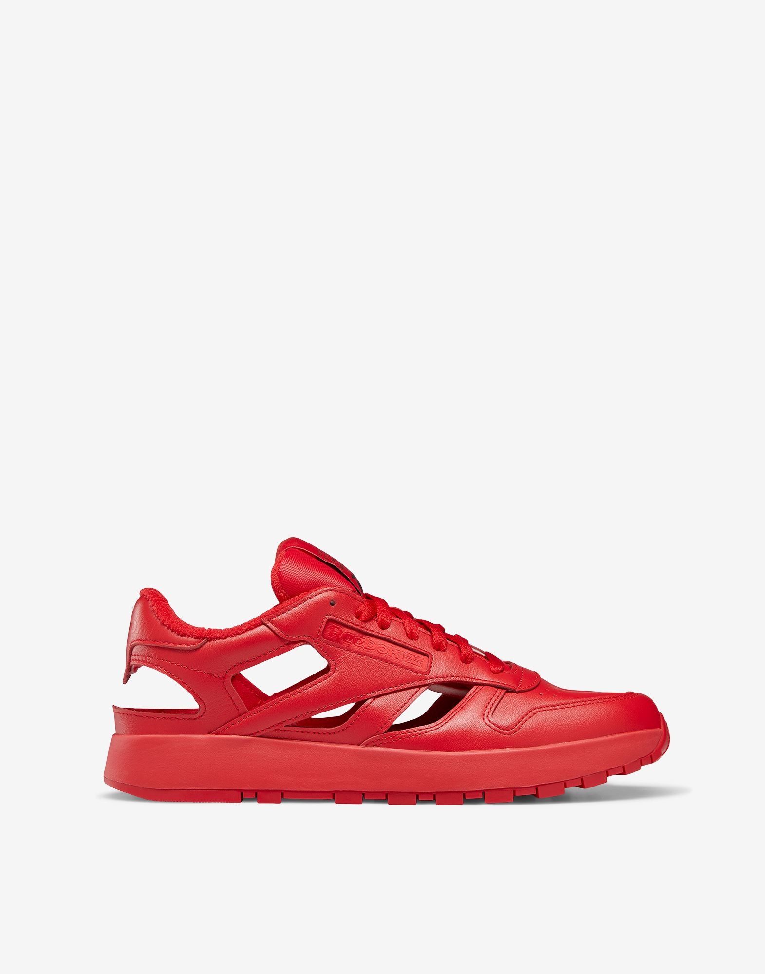 Reebok classic low-top runner in leather from 1985, reimagined in a couture variation with the Maison's signature Décortiqué aesthetic. Cut-out detailing elevates the "Anonimity of the lining" concept by revealing the inner lining and is reminiscent of a cage-like shape. Its split toe is inspired by the iconic Tabi shoe from 1988. The sneaker features dual logos on the tongue, with the Reebok signature on the side paneling and rear, while the hallmark Margiela stitch moniker adorns the back. Tonal Velcro closures and laces complete the style. Item details 100% Bovine leather Leather Brand logo Solid color Laces Round toeline Fully lined Rubber sole Contains non-textile parts of animal origin