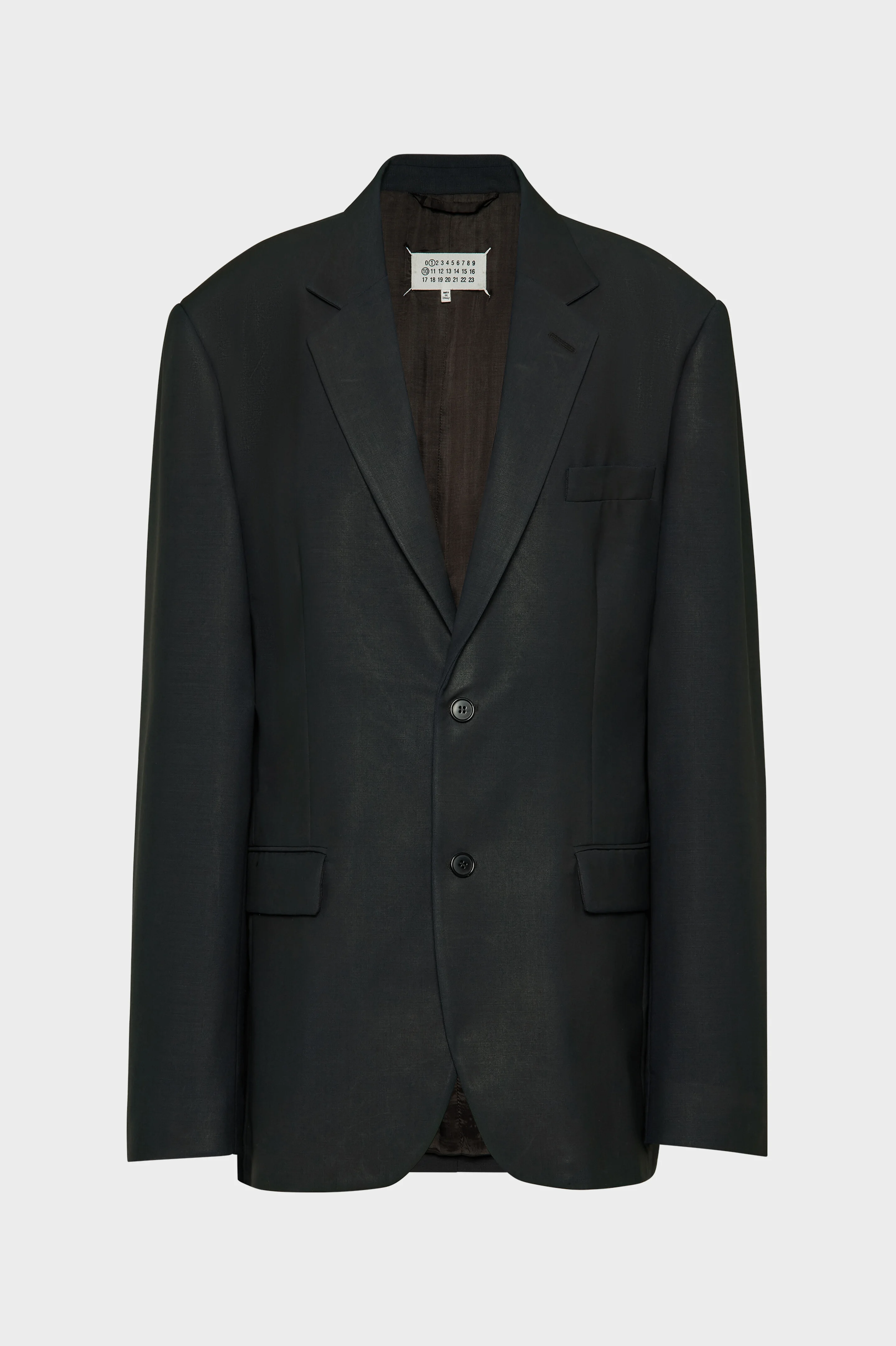 Crafted from mohair wool, the suit jacket has a long-line silhouette with slightly oversized proportions. It features single-breasted buttons, a notched collar, pockets and buttons at the cuffs. Two work-in-progress cross-stitches adorn the back hem to allude to a garment never being finished. Maison Margiela's signature, the four stitches, appear at the back; the opposite of a label. Product Details Item ID S51BN0431M35301510 Primary Fabric: 60% Mohair 40% Wool Lining: 100% Viscose-Rayon Pocket Lining: 100% Cotton Wool mohair suit jacket Hand-applied Greasy Patina technique Notch lapel Single-breasted closure Welt pocket Flap pockets Buttoned cuffs Four stitches at the back Made in Italy Model is 178 cm tall and wears a size 40.