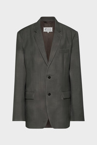 The notched collar blazer comes in a wool mohair blend with hand-applied greasy patina technique for a worn, uneven finish. With a single-breasted closure, the jacket is finished with a chest pocket, flap pockets and comes without a back vent for a clean silhouette. Maison Margiela's signature, the Four stitches, appear at the back; the opposite of a label. Product Details Item ID S51BN0431M35141853 Composition: 60% mohair, 40% wool Lining: 100% viscose-rayon Pocket lining: 100% cotton Wool mohair suit jacket Hand-applied Greasy Patina technique Notch lapel Single-breasted closure Welt pocket Flap pockets Buttoned cuffs Four stitches at the back Made in Italy Model is 5'8" tall and wears a size 40.