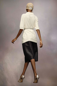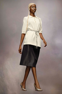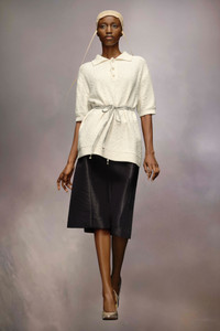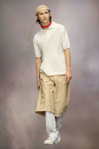In nostalgic boucle knit, the short-sleeved polo shirt has three buttons and ribbed trims. Maison Margiela's signature, the four stitches, appear at the back; the opposite of a label. String is used for styling only. The model is 175cm tall. Model wears size S.