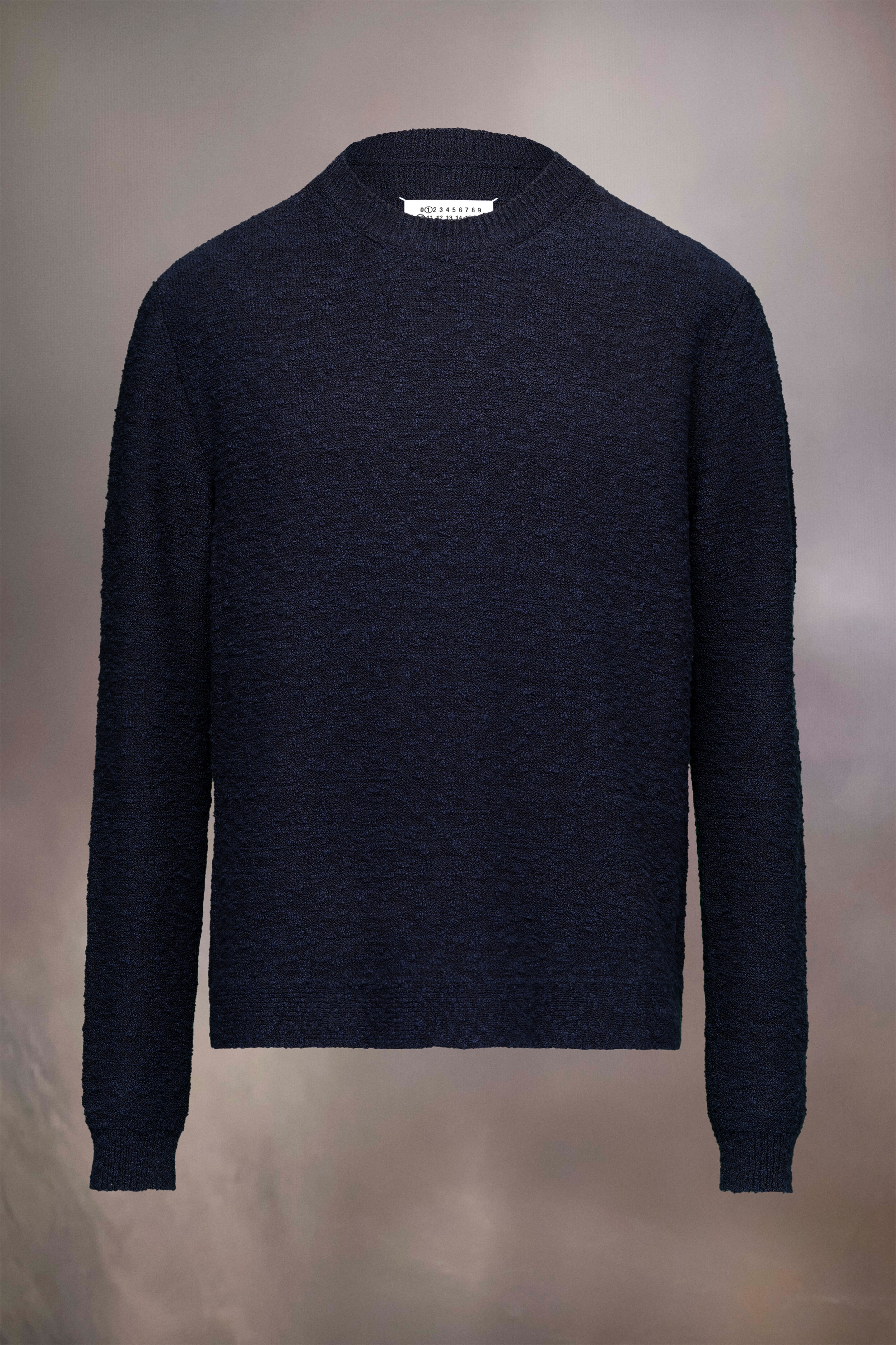 In nostalgic boucle knit, the top has long sleeves and a crew-neck with ribbed trims and textured finish. Maison Margiela's signature, the four stitches, appear at the back; the opposite of a label. Gauge 5. Product Details Item ID S51HL0005S18197511 Primary fabric: 82% cotton, 18% nylon Gauge 7 Boucle jersey Crewneck Ribbed trims Four stitches at the back Made in Italy