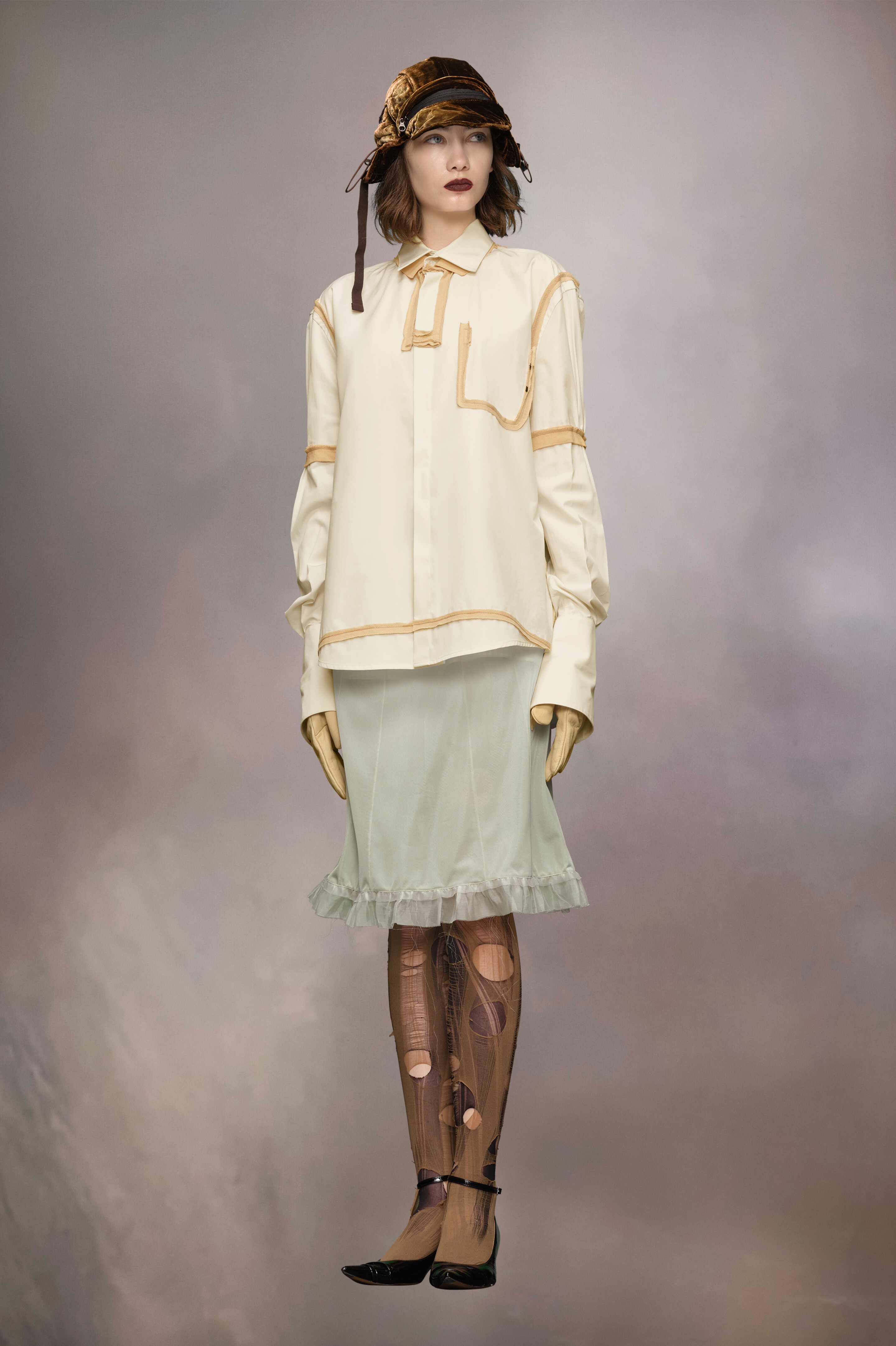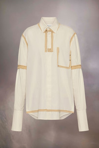 Crafted from cotton, the classic shirt appears reworked with Decortique polo shirt elements, creating contrast under the collar, at the shoulders, around the hem and on the missing chest pocket. The sleeves are extra-long to play with proportion, with a hidden button placket, smart back pleats and curved hem. Maison Margiela's signature, the four stitches, appear at the back; the opposite of a label. Product Details Item ID S51DT0018M35391101 Primary Fabric: 100% Cotton Cotton shirt Pointed collar Mother of pearl button closure Buttoned cuffs Curved hem Decortique details Four stitches at the back Made in Italy Model is 178 cm tall and wears a size 40.