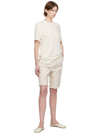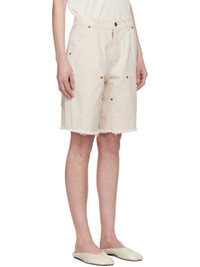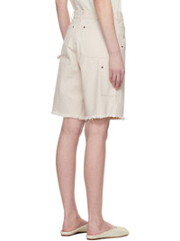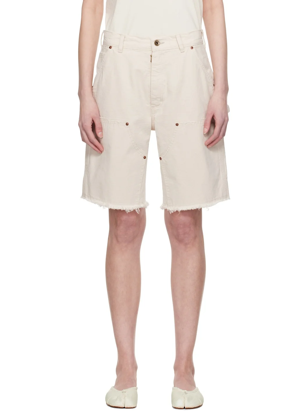 Cotton canvas shorts. Distressing throughout. · Belt loops · Five-pocket styling · Zip-fly · Frayed edge at cuffs · Hammer loop and patch pockets at outseam · White stitching at back pocket Supplier color: Ecru Body: 100% cotton. Lining: 65% polyester, 35% cotton. Made in Italy 251168F088006
